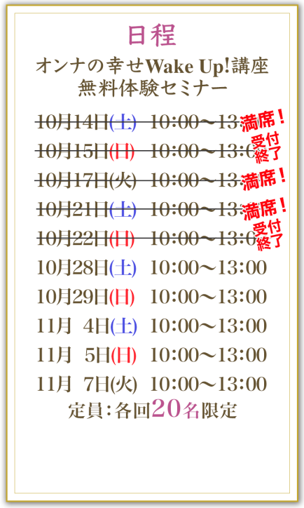 「もっと女を楽しみたい!」誰かの期待に答える生き方じゃなくて、「女の幸せ」を感じながら毎日を送りたい!そんな女性のために『オンナ脳の取説(トリセツ)』をお届けするのが、『オンナの幸せWake Up!講座』です^^)